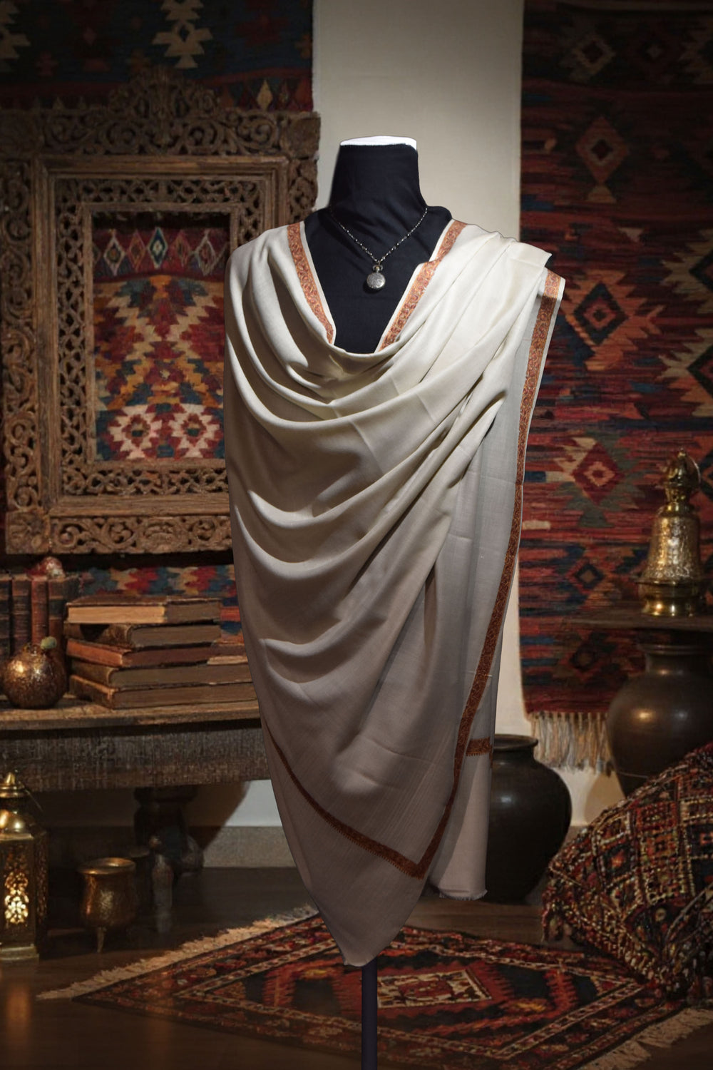 An emblem of refined artistry, this Hashiya shawl graces pure pashmina with an exquisite four-sided border. Each edge is meticulously adorned with traditional motifs, lending balance, beauty, and sophistication to the piece. Soft to touch and regal in presence, it embodies the essence of heritage woven into every thread.