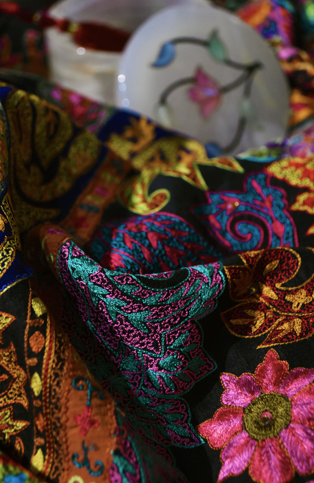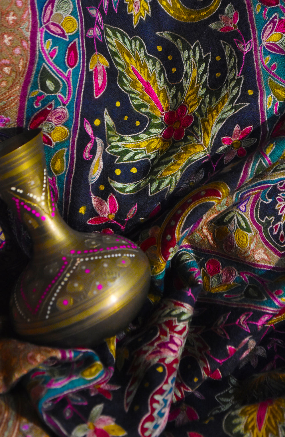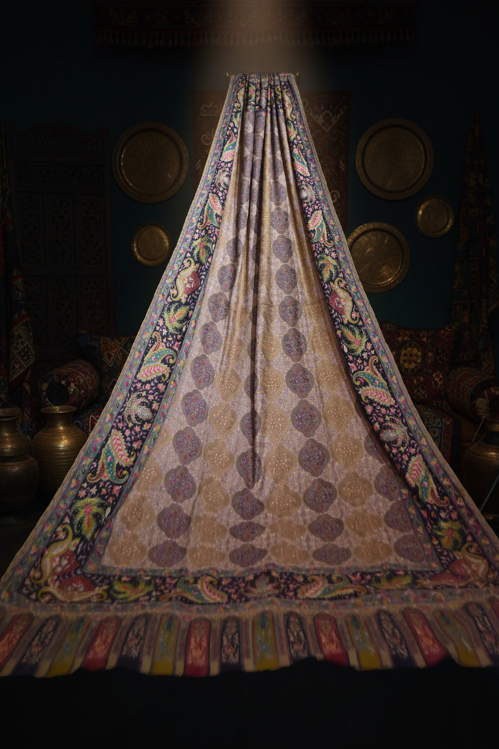 A vision of contrast and heritage, this pure Pashtoosh 9D Kalamkari shawl unfolds against a soft beige canvas, bordered with the commanding depth of black all-over patterns. Hand-finished with Nalki work detailing, each motif resonates with quiet regality and enduring grace. Measured at 2.5 yards, this piece is an heirloom of balance — bold yet understated, powerful yet poetic