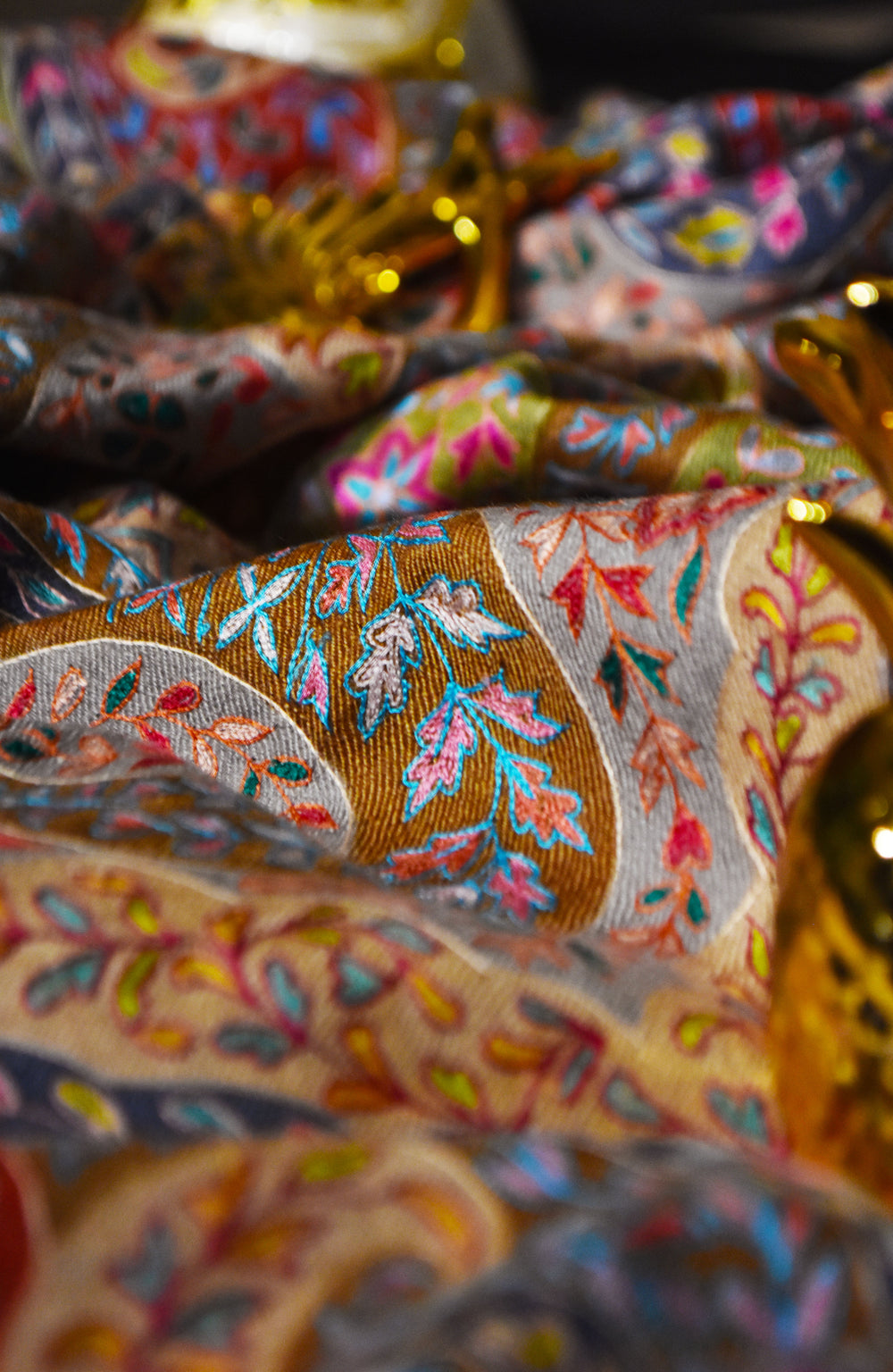 This pure Pashtoosh 9D Kalamkari shawl radiates artistry through its all-over border of regal purple and pink tones, delicately accented with softer hues. Intricate Nalki work breathes brilliance into every motif, making this 2.5-yard drape an ode to meticulous craftsmanship. A wearable heirloom, it balances bold tradition with delicate grace — a timeless treasure of Dastoor