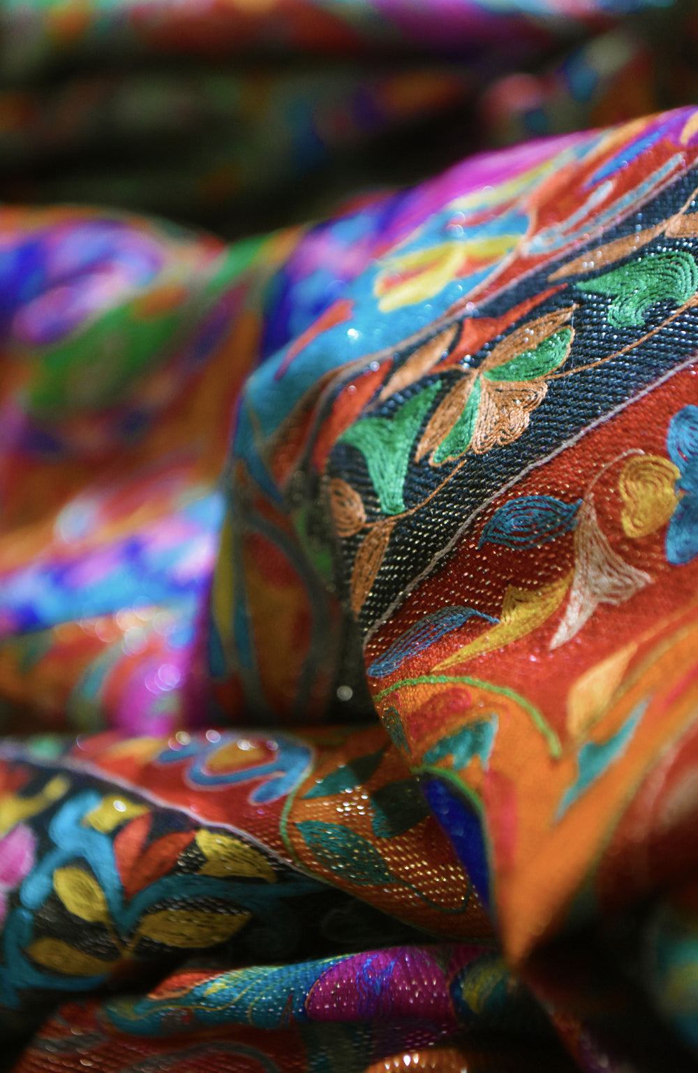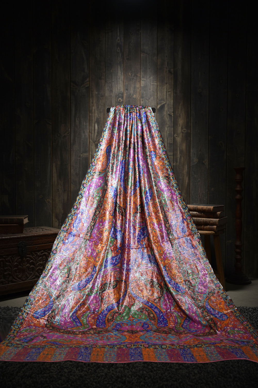 In a symphony of color and light, this pure pashmina shawl carries the brilliance of Moonlight Kalamkar, accented with fine Nalki outlines. Its striking multi-color border — glowing in orange, blue, and maroon — weaves a story of bold regality. The luminous finish of silver moonlight, with options in gold and rose gold, elevates this 2.5-yard heirloom into a timeless celebration of artistry and light.