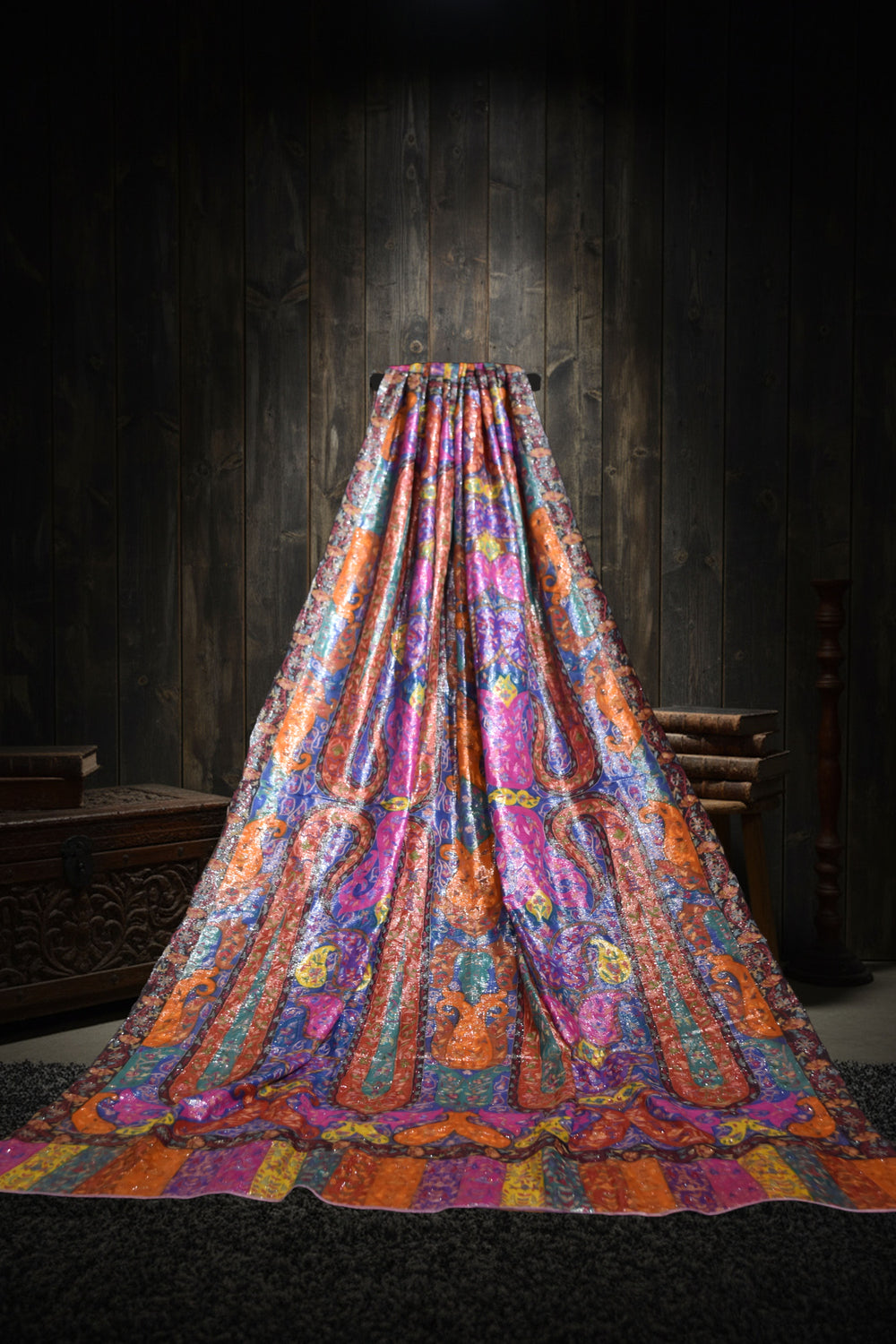 A radiant expression of heritage, this pure pashmina shawl glows with the artistry of Moonlight Kalamkar, delicately outlined with Nalki handwork. Its vibrant multi-color border of yellow, pink, and purple dances against the soft drape, while shimmering tones of silver moonlight (also available in gold and rose gold) bring ethereal brilliance. Measuring 2.5 yards, this piece is not just a shawl but a celebration of light, color, and timeless craft.