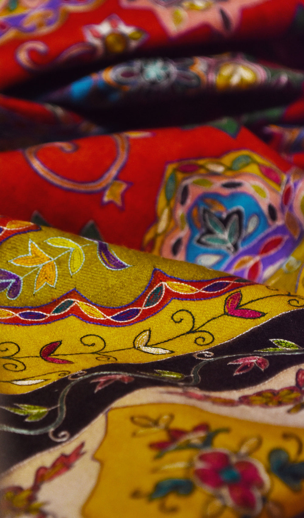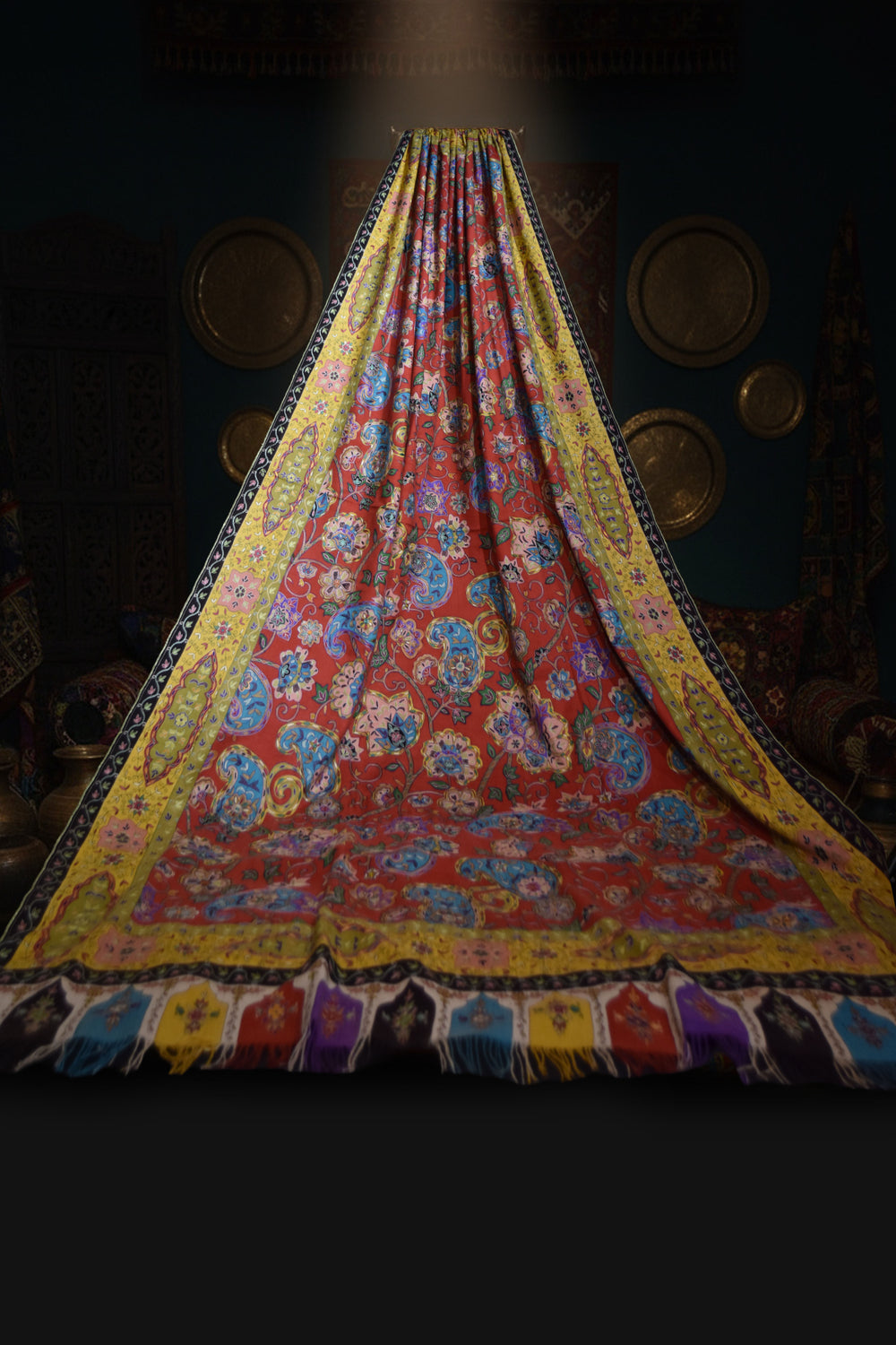 A masterpiece of heritage artistry, this pure Pashtoosh shawl unveils the grandeur of Kalamkari tradition, elevated with rare Nalki handwork. Its radiant yellow expanse is crowned with an all-over multicolored border, where every hue speaks of timeless regality. Spanning 2.5 yards, it carries the warmth of craft and the vibrance of storytelling — an heirloom that wraps history in brilliance