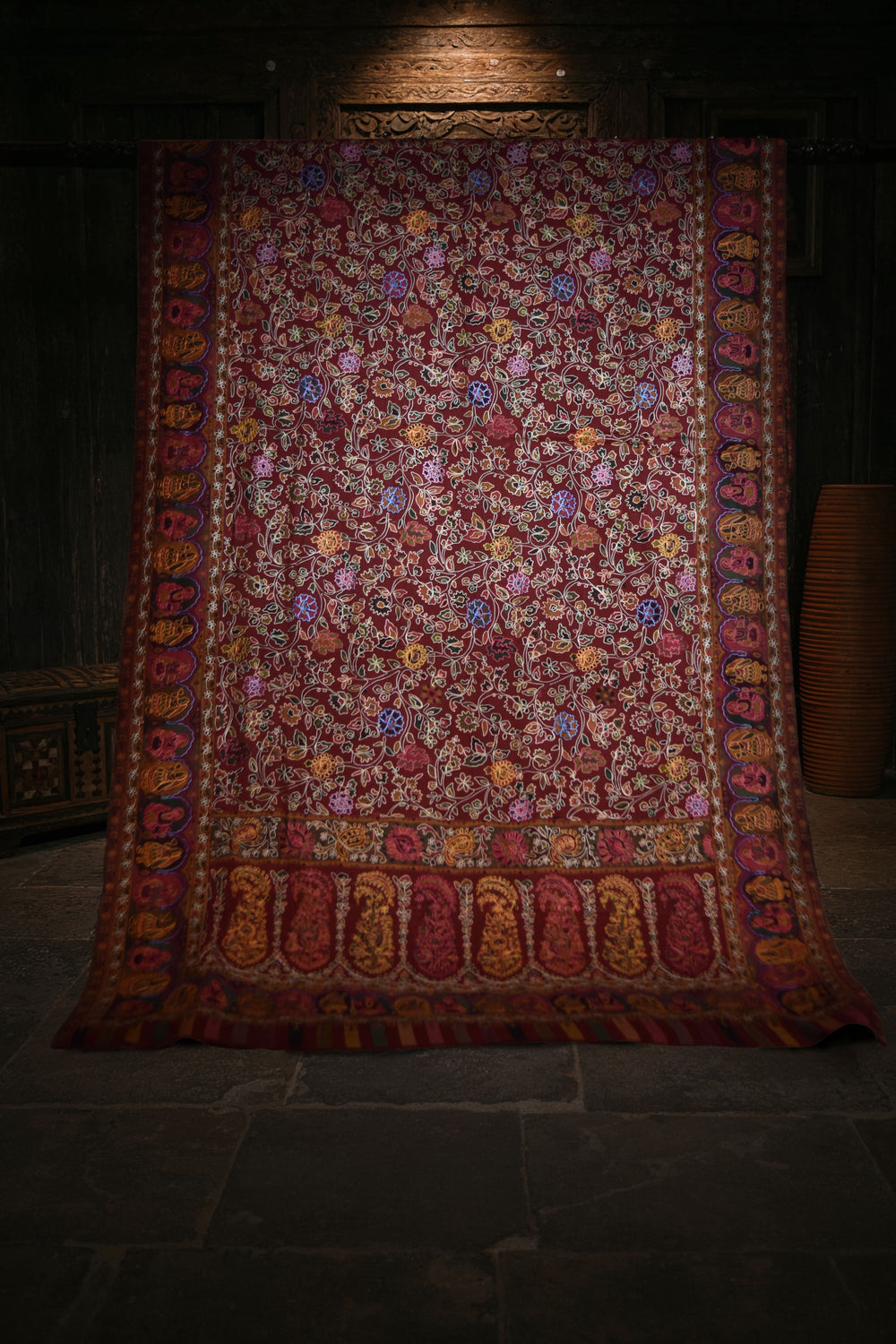 An ode to artisanal heritage, this Kaani Kalamkar shawl is crafted from the finest pure Pashmina, adorned with intricate Nalki outlines that trace each motif with quiet brilliance. The fusion of Kaani’s woven artistry and Kalamkar’s painted grace creates a tapestry of timeless elegance. Lightweight yet luxuriant, it drapes like a whisper of tradition — refined, radiant, and eternally poised.