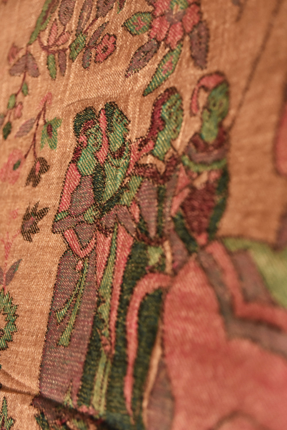 A tribute to regal artistry, this Shikargha Kaani shawl on pure Pashmina captures the grandeur of heritage storytelling. Intricately woven hunting motifs come alive through the age-old Kaani technique, while a lustrous Banarsi border frames the piece in timeless opulence. Each fold embodies craftsmanship and culture — an heirloom of warmth, intricacy, and grace.